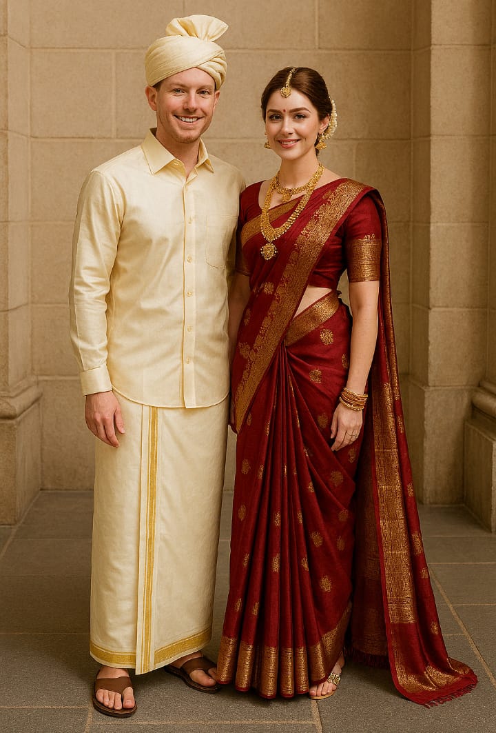 Women's Tamil Cultural Saree with Men's Tamil Veshti & Shirt